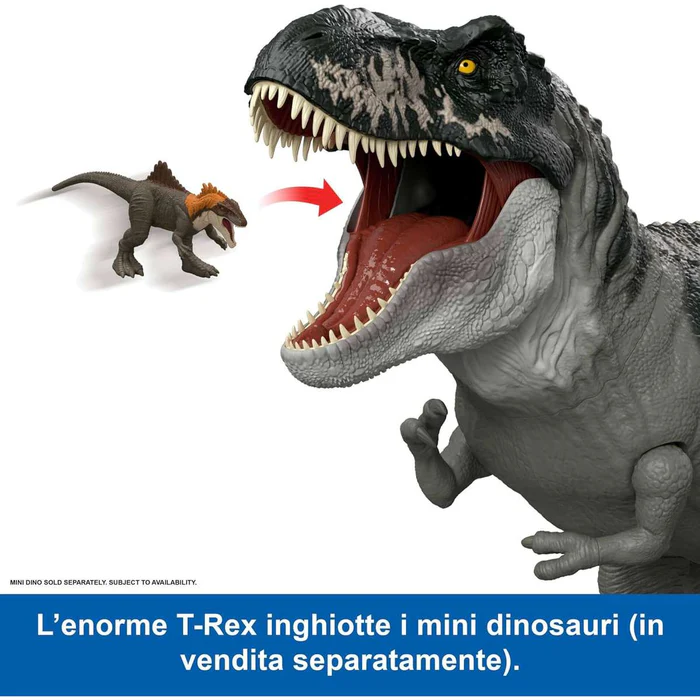 Doppia azione feroce per un divertimento realistico Il T-Rex è dotato di due attacchi spettacolari: la bocca si apre fino a 35 gradi per simulare un morso realistico e “ingoiare” mini dinosauri (venduti separatamente).