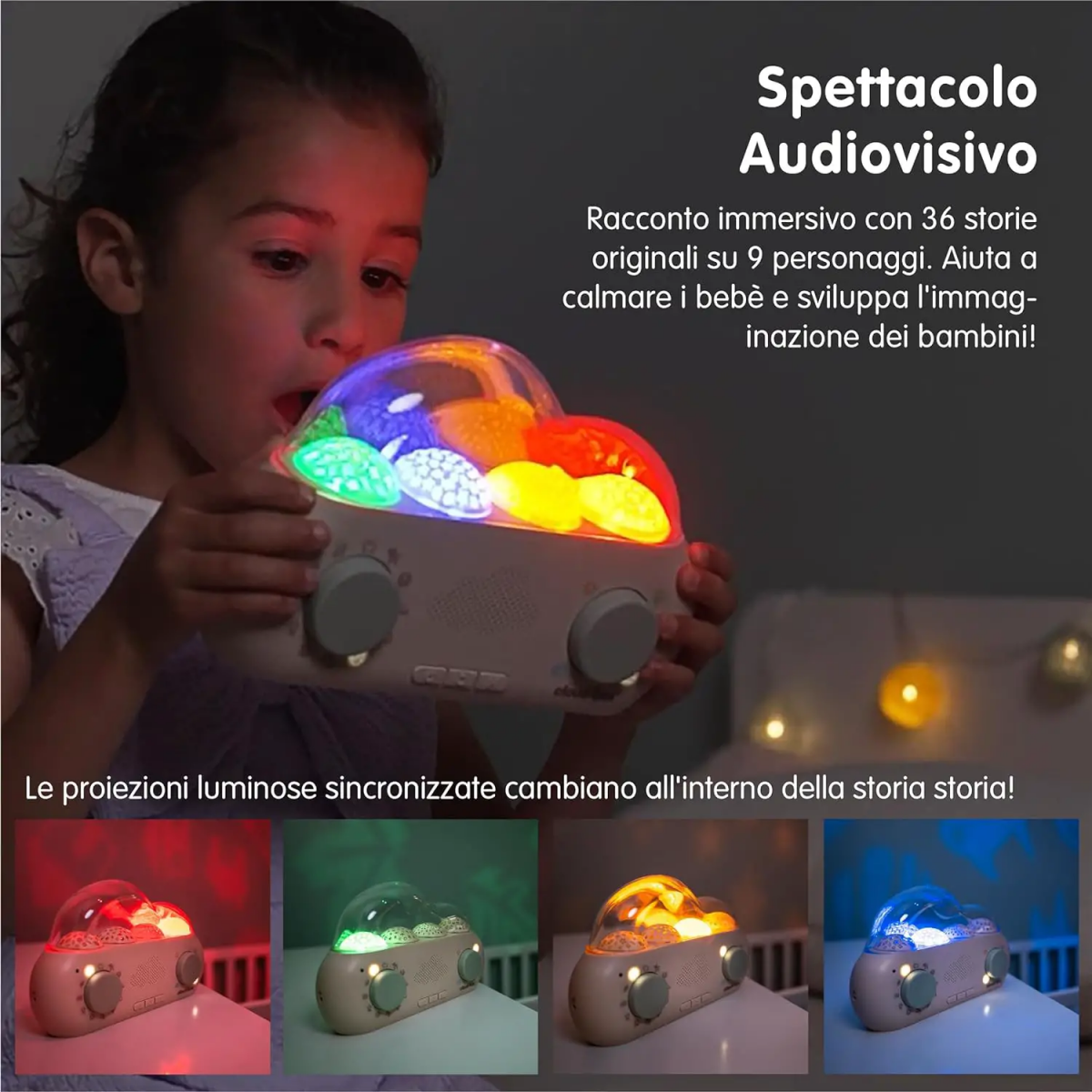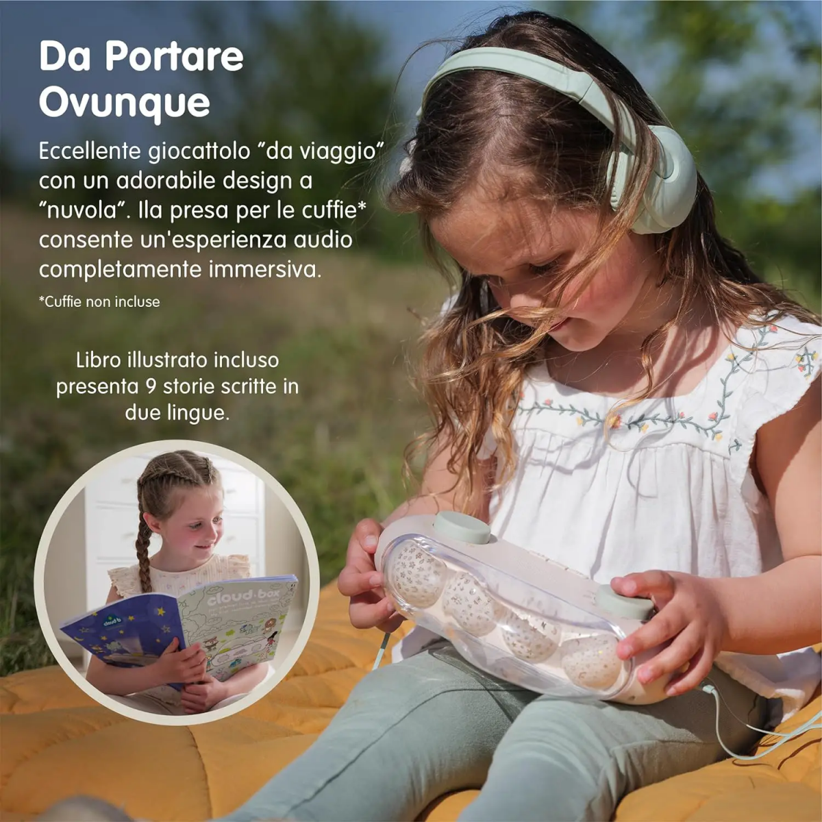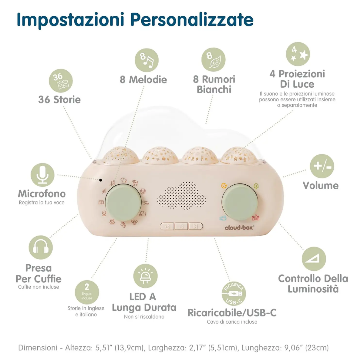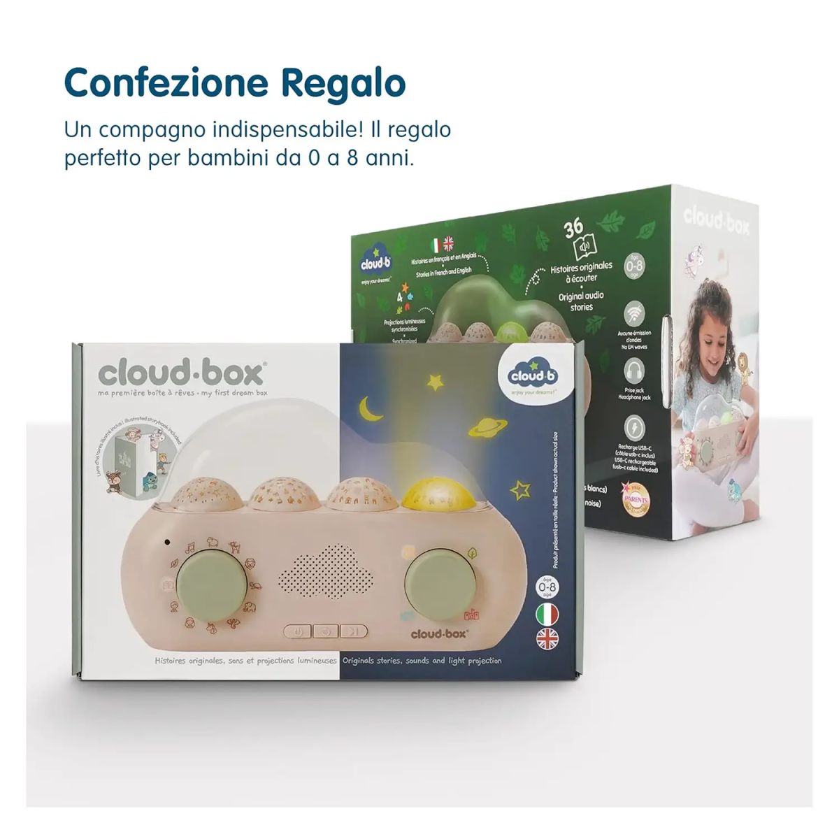 Cloud B - Luce Notturna Cloud Box: Una Notte di Meraviglie Scopri il Cloud B - Cloud Box, l’innovativo raccontastorie che unisce narrazione, suoni rilassanti e proiezioni di luce. Progettato per bambini da 0 a 8 anni, Cloud Box offre 36 storie originali, 8 melodie, e 8 rumori bianchi, tutti accompagnati da 4 proiezioni di luce sincronizzate che cambiano con ogni storia, creando un magico spettacolo visivo.