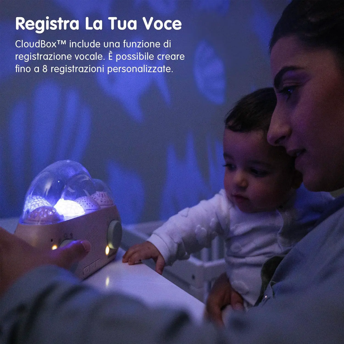 Funzione di Registrazione Personalizzata Cloud Box non è solo un raccontastorie ma anche un registratore personale. I genitori possono registrare messaggi o cantare la ninna nanna preferita del bambino, salvando fino a 8 registrazioni personali, rendendo ogni notte un’esperienza unica e rassicurante.
