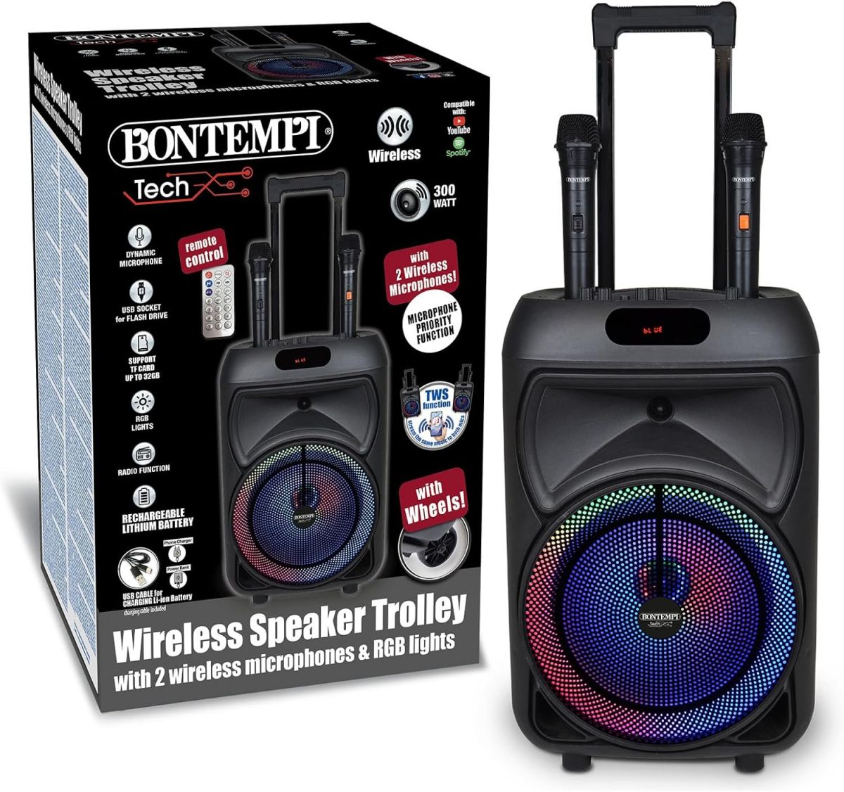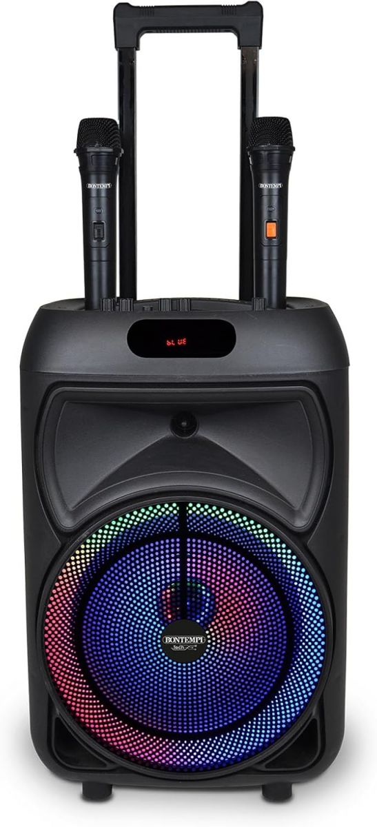 CASSA WIRELESS: Cassa trolley acustica con 2 microfoni senza filo e luci RGB per performance audio e visive coinvolgenti.