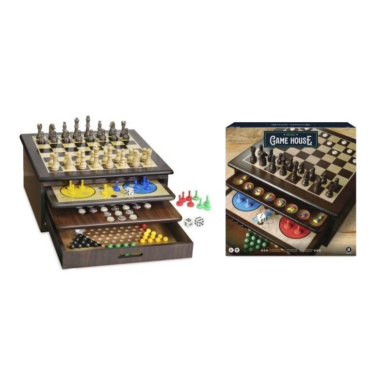 Cofanetto vari giochi, con vassoi facilmente estraibili per passare da un gioco all'altro, comodo spazio per riporre tutti gli accessori. Pedine di gioco di grandi dimensioni