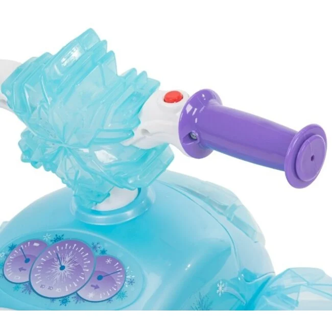 Questa moto per bambini Disney Frozen ha un serbatoio a bolle sul retro con un interruttore on/off e un cuore illuminato sul davanti con un pulsante sul manubrio.