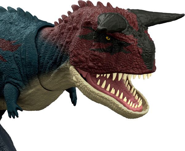 Il dinosauro giocattolo Jurassic World Charge N Chomp Carnotaurus riproduce realisticamente i movimenti di camminata, morso e ruggito, attivabili premendo un pulsante sulla coda. Le sue zampe mobili offrono un'azione dinamica: in modalità camminata, il dinosauro attacca, in modalità morso, si difende. Un codice QR sul suo piede sblocca il dinosauro nell'app gratuita Jurassic World Play, che include un dinosauro digitale e un emozionante gioco di corse con veicoli su terra, in acqua e in aria. Possono verificarsi variazioni di colore e design