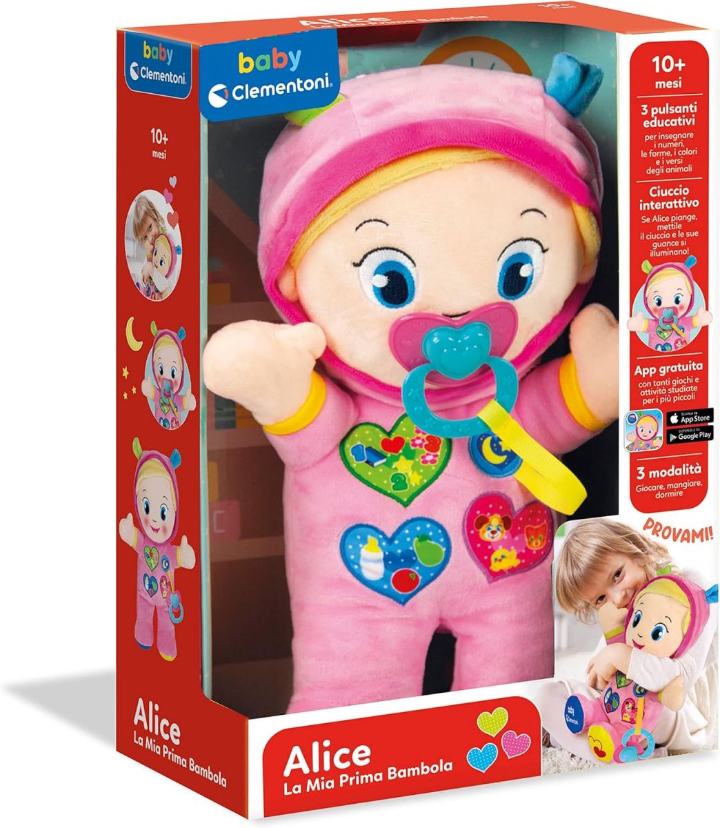 ALICE, LA MIA PRIMA BAMBOLA: una tenera bambola educativa parlante, in morbida stoffa, con tasti interattivi per insegnare ai più piccoli le prime lettere, i numeri e tante altre parole e un ciuccio per attivare la modalità nanna