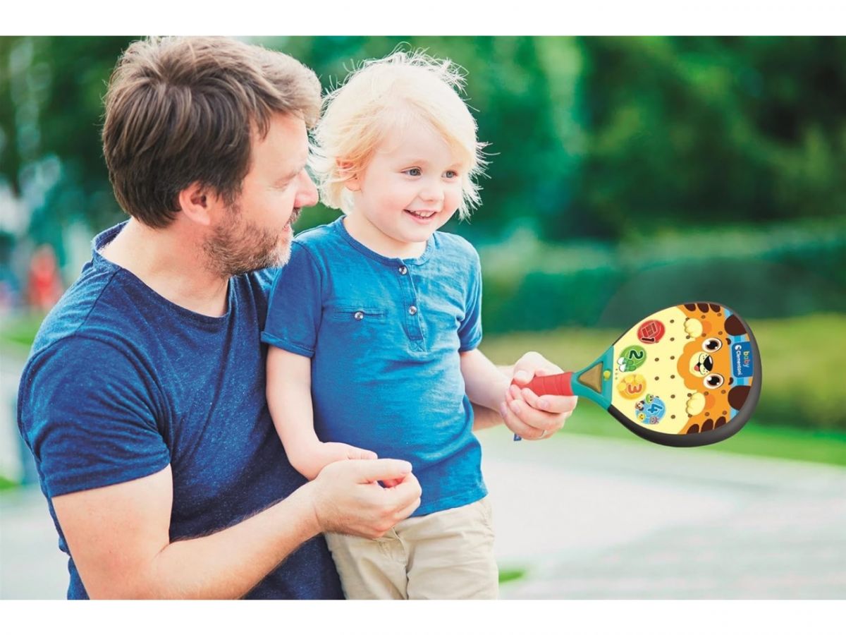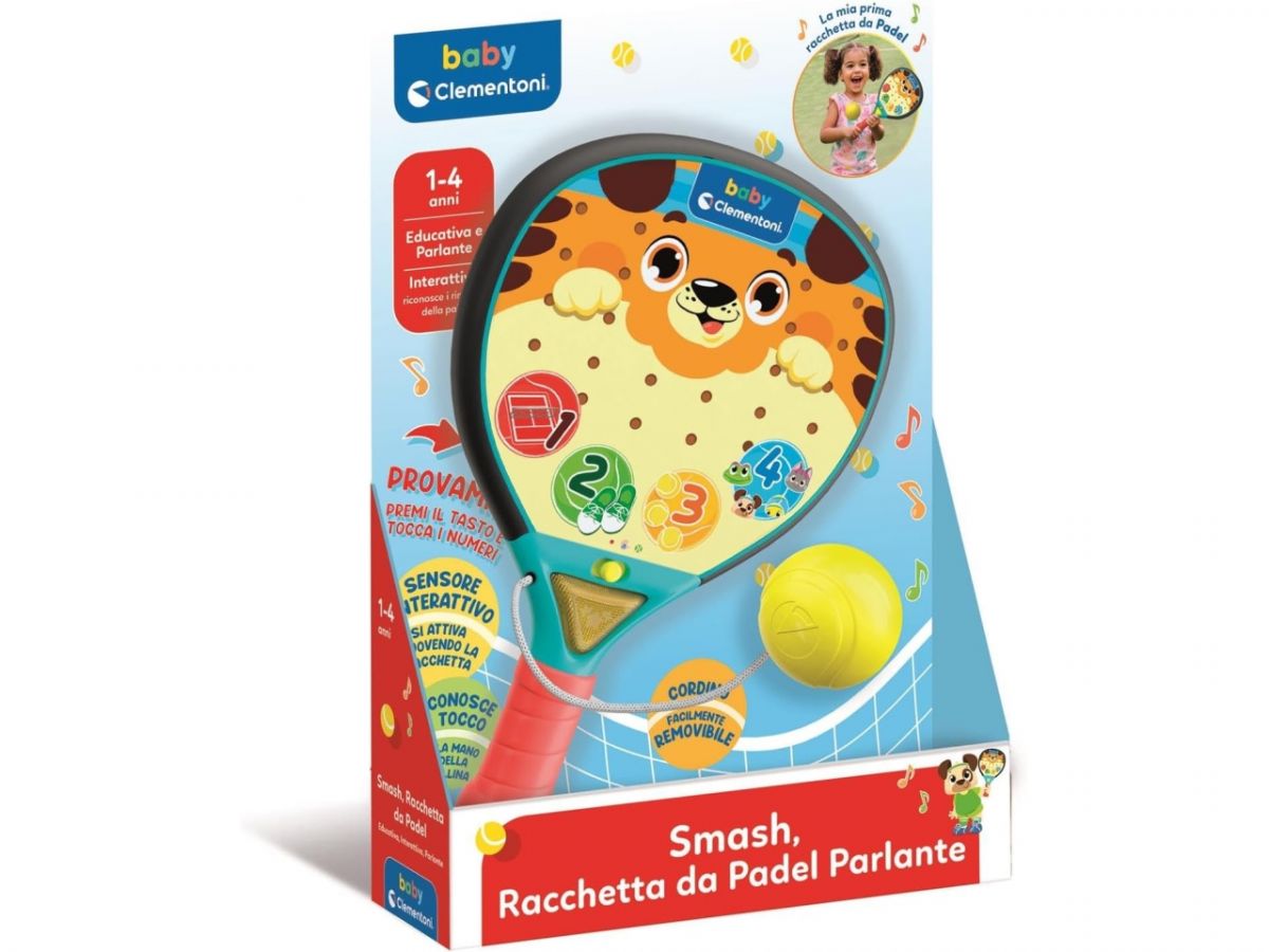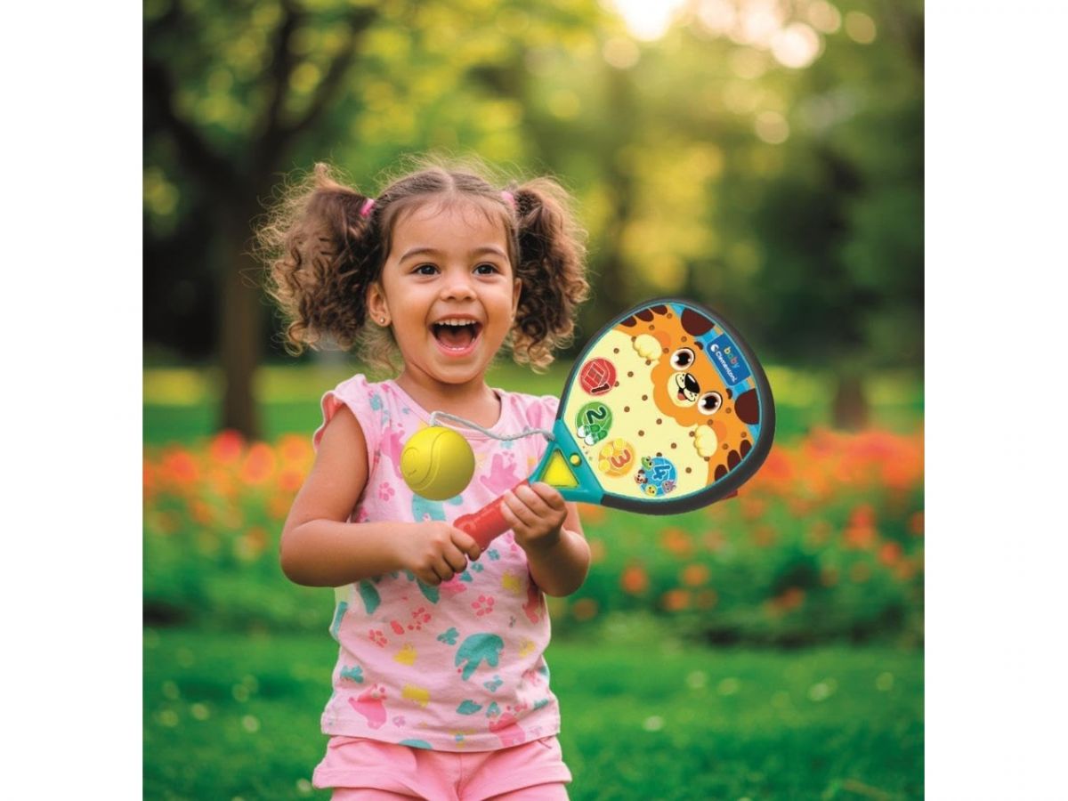Una racchetta interattiva per giocare come i grandi, con modalità educativa e interattiva, con pallina integrata e cordino rimovibile. Racchetta da padel interattiva che aiuta a sviluppare manualità, coordinazione e linguaggio attraverso canzoni, suoni e frasi in italiano.