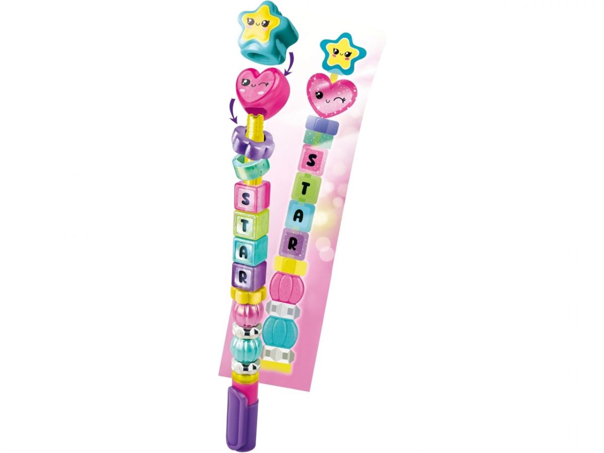 Il set permette di creare penne personalizzate componendo messaggi con lettere, perline e charms, arricchendole con distanziatori, decorazioni e adesivi, stimolando creatività, coordinazione occhio-mano e precisione manuale.