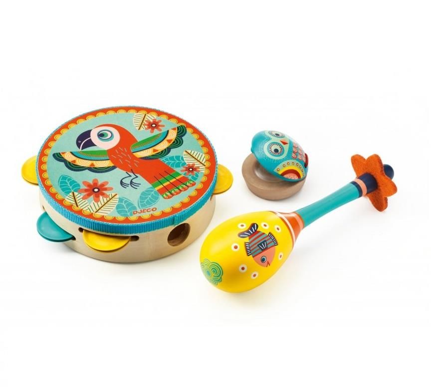 Set composto da tre strumenti musicali diversi: tamburo, nacchere e maracas, di Djeco. Strumenti in legno e metallo perfettamente funzionanti e splendidamente decorati! Prodotto dalla francese DJECO, azienda specializzata in giochi creativi e materiali educativi per bambini.Componenti: 3 strumenti musicali (maracas - tamburo - nacchera).