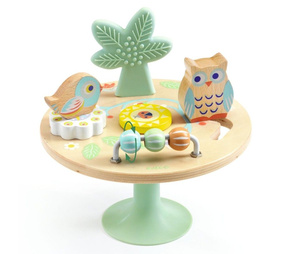 Una tavola da fissare su qualsiasi superficie liscia grazie alla ventosa con tante attività: Palline da far girare, gufo che si muove su un percorso, uccellino che ruota sul suo fiorellino e una palma in silicone da mordicchiare!