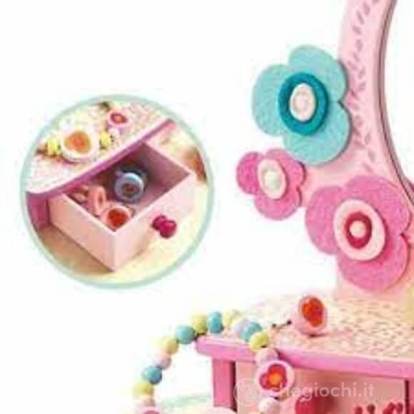 Flora coiffeuse è una fantastica specchiera di legno con un grande specchio per permettere alle bimbe di farsi belle! Due cassetti per sistemare i gioielli e numerosi accessori per farsi belle.