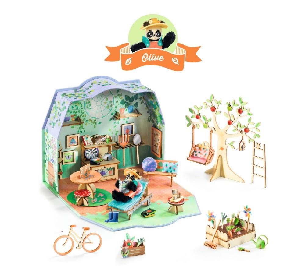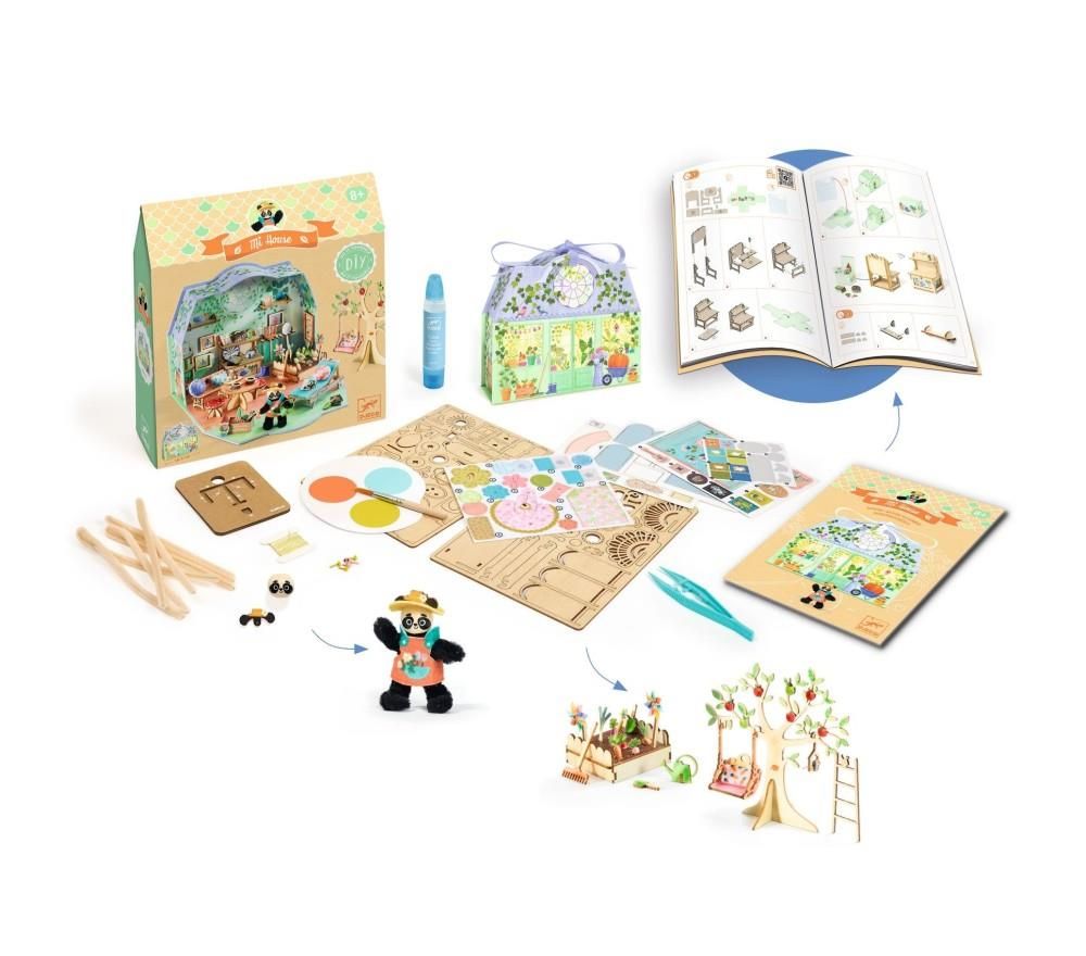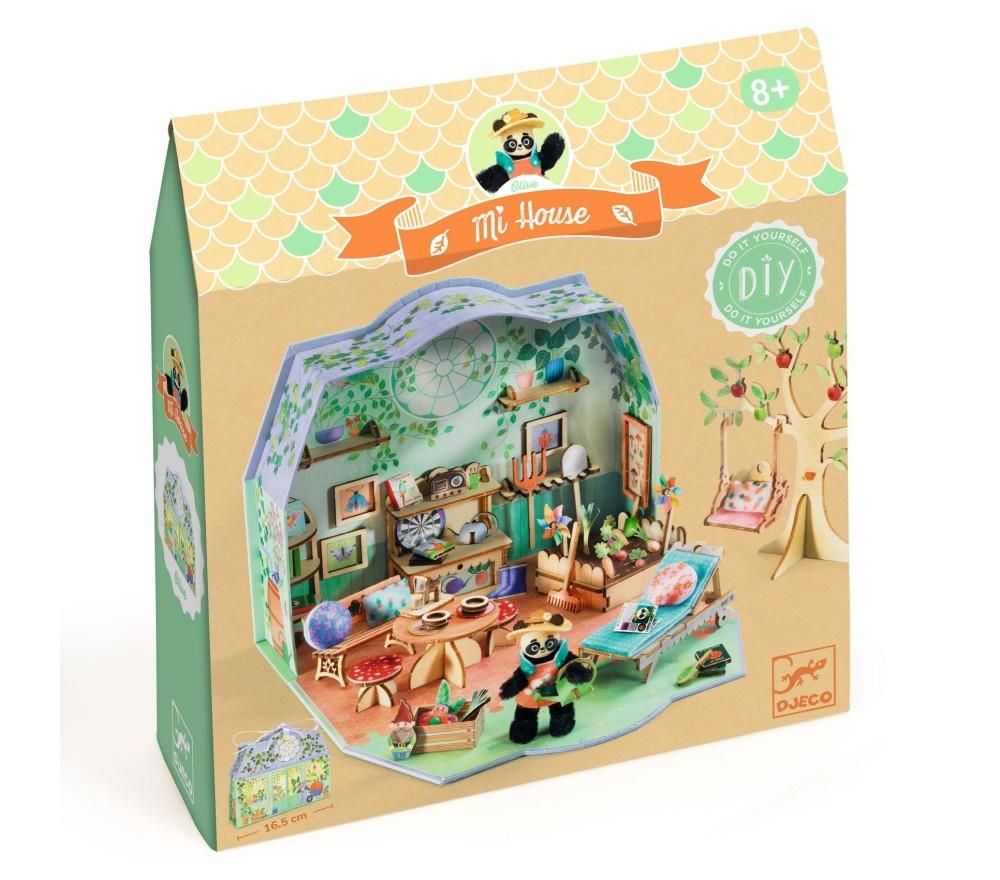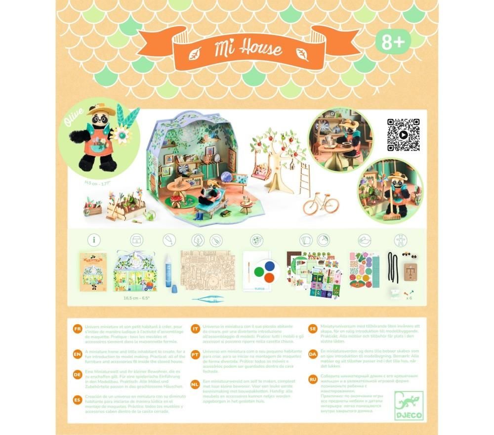 Mi House è la nuovissima linea di Djeco che avvicina i bimbi all'arte del modellismo e delle miniature. Con questo kit i bambini potranno dipingere e assemblare mobili e accessori per creare una meravigliosa casetta in miniatura. Il libretto di istruzioni e un video guidano i bimbi passo dopo passo per creare un meraviglioso piccolo mondo, ricchissimo di dettagli. Un gioco creativo che sviluppa la manualità e darà grandi soddisfazioni! Una volta finita la parte creativa… largo all'immaginazione! Con il personaggio incluso i bambini potranno inventare mille e più storie, vivendo fantastiche avventure! Questa è la casetta del panda Olive, che adora il giardinaggio, curare il proprio orto... ma anche divertirsi giocando o rilassarsi sul dondolo sull'albero! Contenuto della confezione: 1 casetta (dimensioni chiusa: 14,5 x 16,5 x 5 cm), 2 assi di legno tagliate al laser, 1 tavolozza di pittura a secco e 1 pennello, 1 tovaglia protettiva, 3 schede di carte pre-tagliate illustrate, 3 schede di adesivi (1 scheda di adesivi illustrati, 1 schede di piccoli adesivi trasparenti, 1 scheda di adesivi di gommapiuma double face), 4 scovolini di ciniglia, 1 testa e le orecchie illustrate di legno, 1 bobina di filo, 1 scheda di elementi di feltro illustrati pre-tagliati, 6 fermacampioni, 1 strumento di cartone per fabbricare i mini personaggi, 1 pinza di precisione, 1 tubo di colla liquida con punta fine, 1 libretto di istruzioni passo passo.