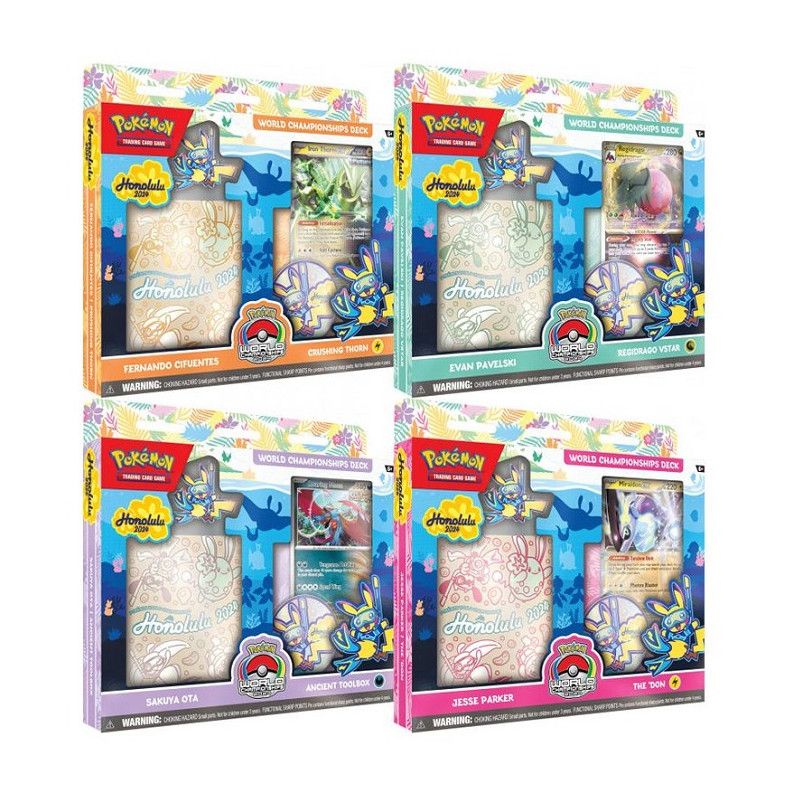 Prodotto in Italiano. Il Pokémon 4x Set Mazzi Campionati Mondiali 2024 – World Championships Deck 2024 è composto dai seguenti 4 Mazzi: Evan Pavelski – Regidrago VStar, Fernando Cifuentes – Crushing Thorn, Jesse Parker – The ‘Don, Sakuya Ota – Ancient Toolbox. In ogni confezione troverai: 1 mazzo caricato a dovere pronto per giocare, completo di 60 carte, 1 libretto dei Campionati Mondiali 2024, 1 spilla speciale dei Campionati Mondiali 2024, 1 moneta dei Campionati Mondiali 2024, 1 portamazzo dei Campionati Mondiali 2024, 1 tabellone di gioco con poster, 1 carta codice per il GCC Pokemon Live.