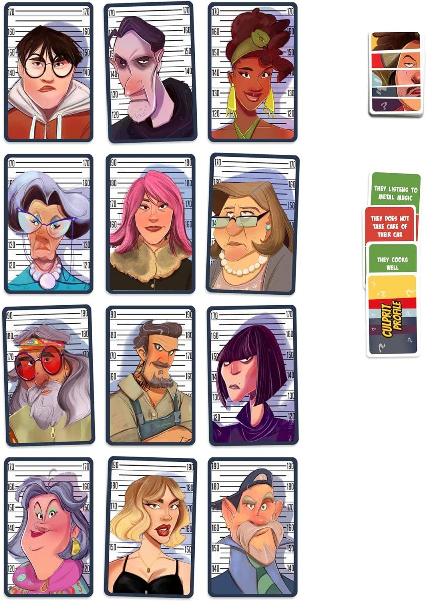 1. Scegli un giocatore per fare il Testimone e gli altri saranno gli Investigatori. 2. Il Testimone cercherà di far indovinare il Colpevole tra i 12 presenti sul tavolo fornendo indizi che si basano sulla sola apparenza. 3. Gli Investigatori dovranno utilizzare gli indizi del Testimone per identificare il Colpevole. 4. Riuscirete a scovare il Colpevole eliminando i Sospettati giusti?