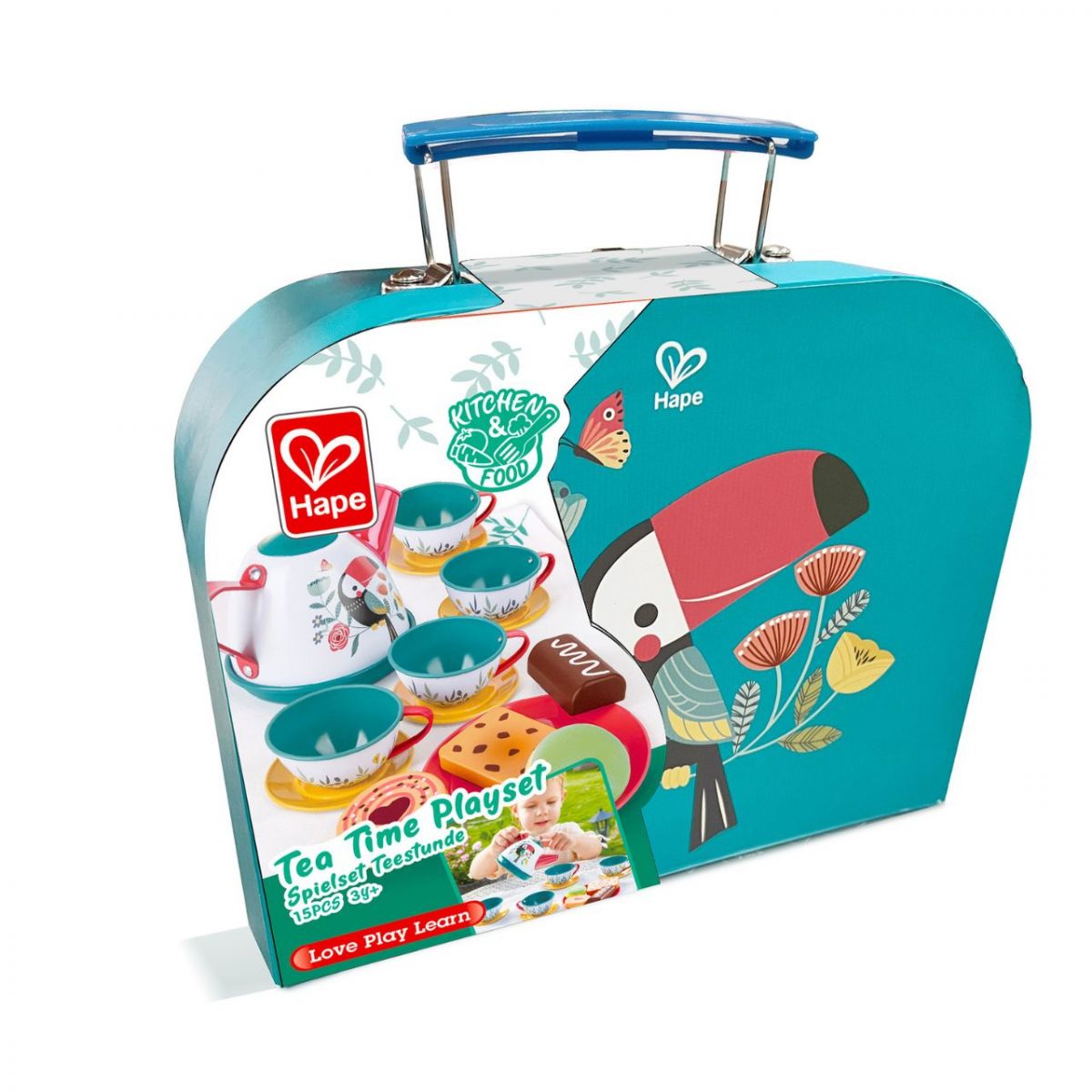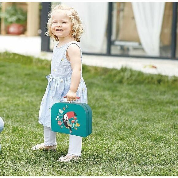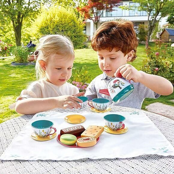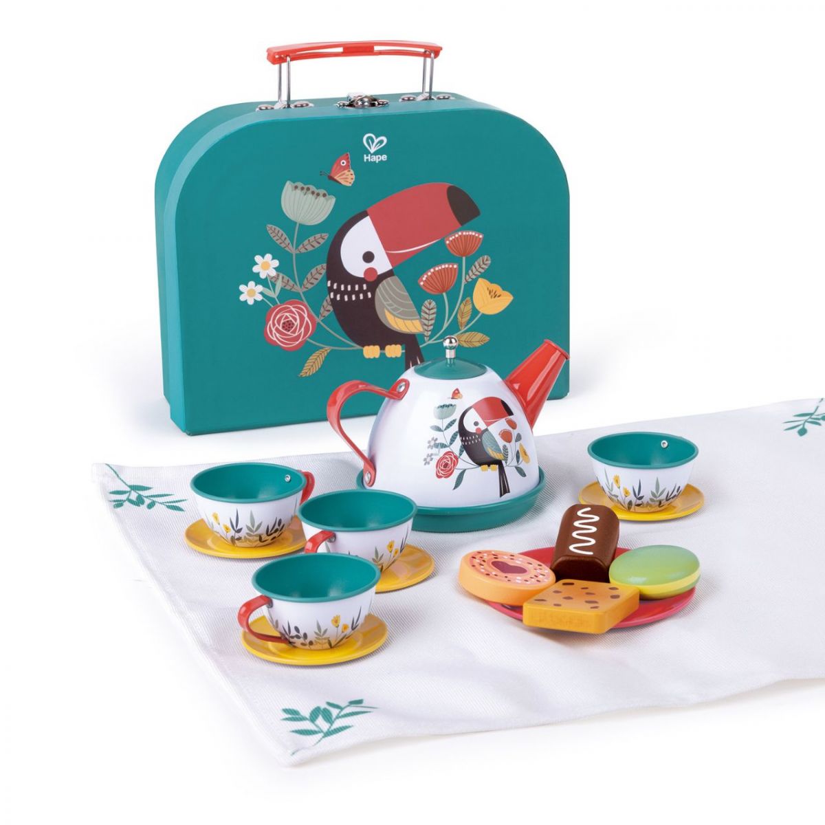 Questo servizio da tè giocattolo contiene tutto il necessario per concedersi una piacevole pausa anche nelle giornate più frenetiche. Apri la tua elegante valigetta e disponi la teiera, le tazze e i biscotti sulla raffinata tovaglia per un momento di relax con bambole e pupazzi o in compagnia di chi vuoi.
